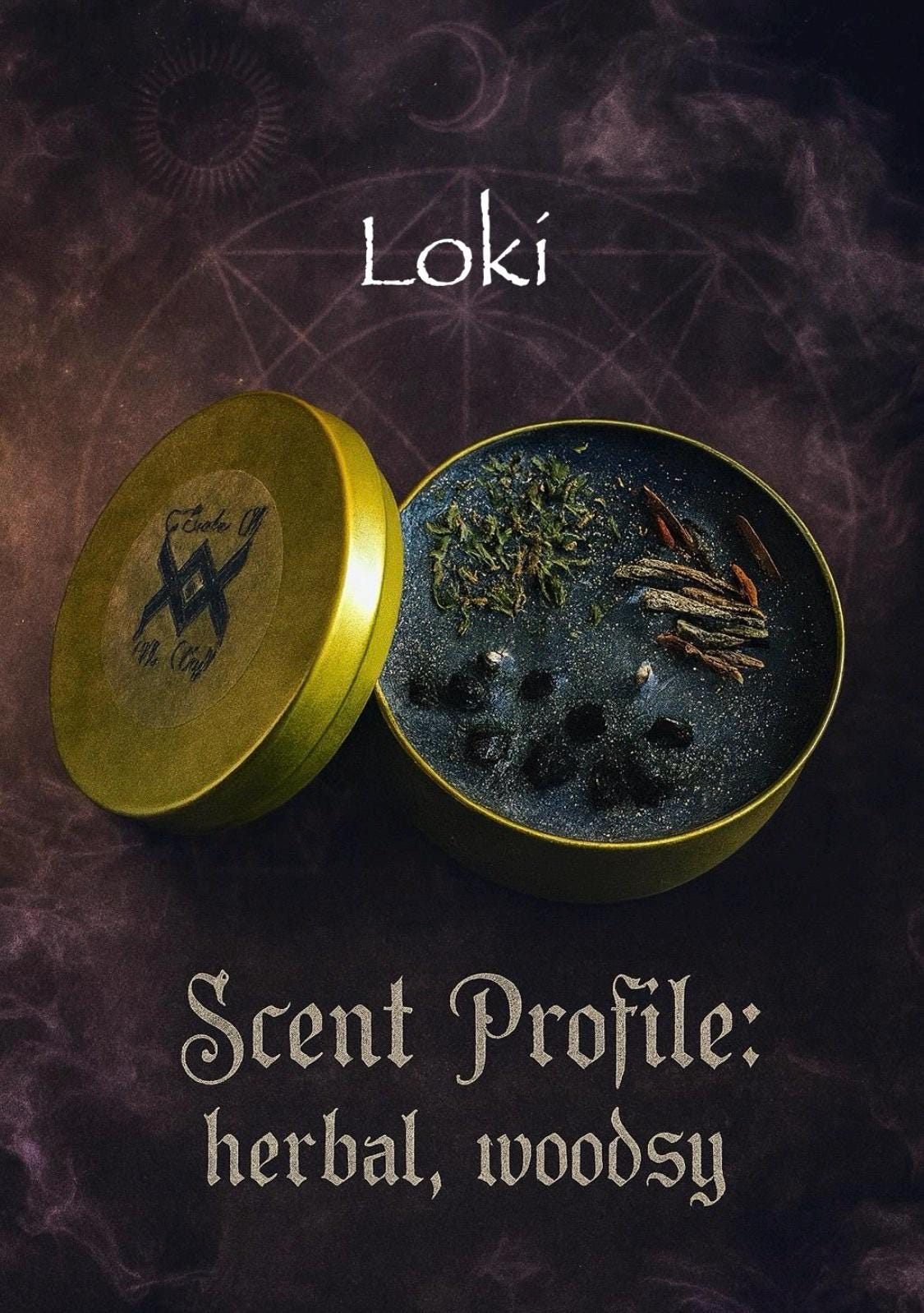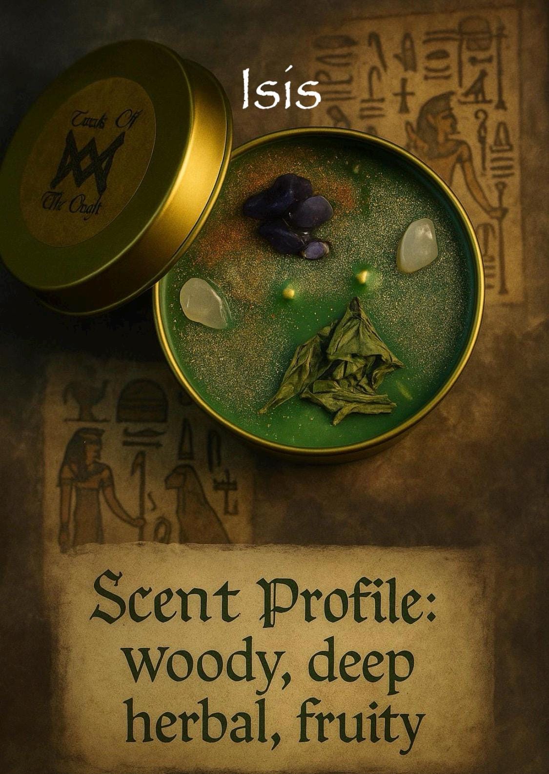 This line features 8-ounce soy candles that have been carefully researched to aid in the cultivation of the listed Diety. While we don’t divulge secret ingredients, the scent profile is included on each product photo.